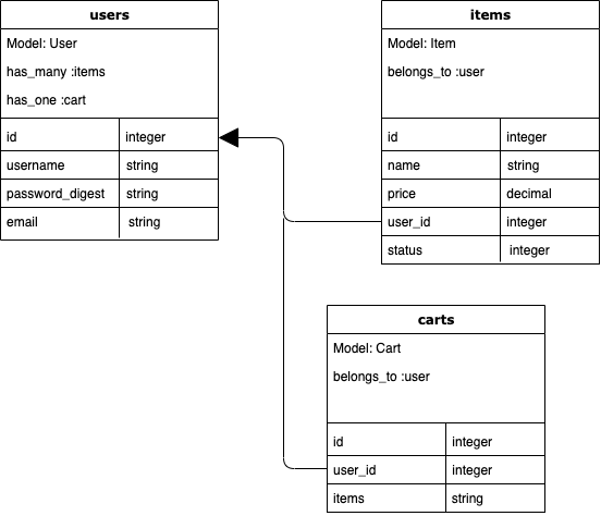 As seem in the schema diagram, a user has many items, an item belongs to a user, a user has one cart, and a cart belongs to a user. The status column for items is an integer and it is used to create two enumerators: listing and purchased. The items column for the carts table is a string because it will be later serialized as an array (more on this in the last section of the article).